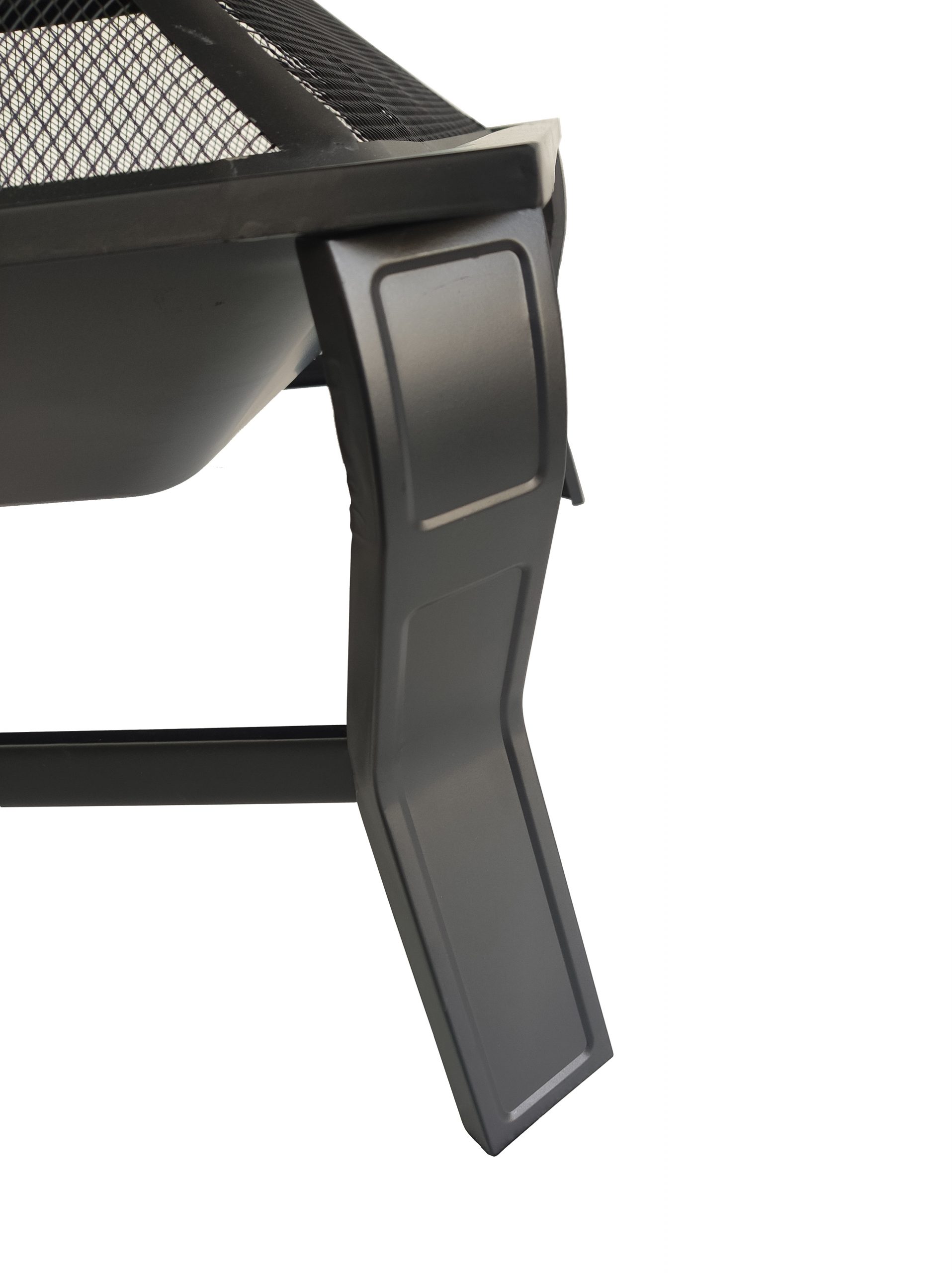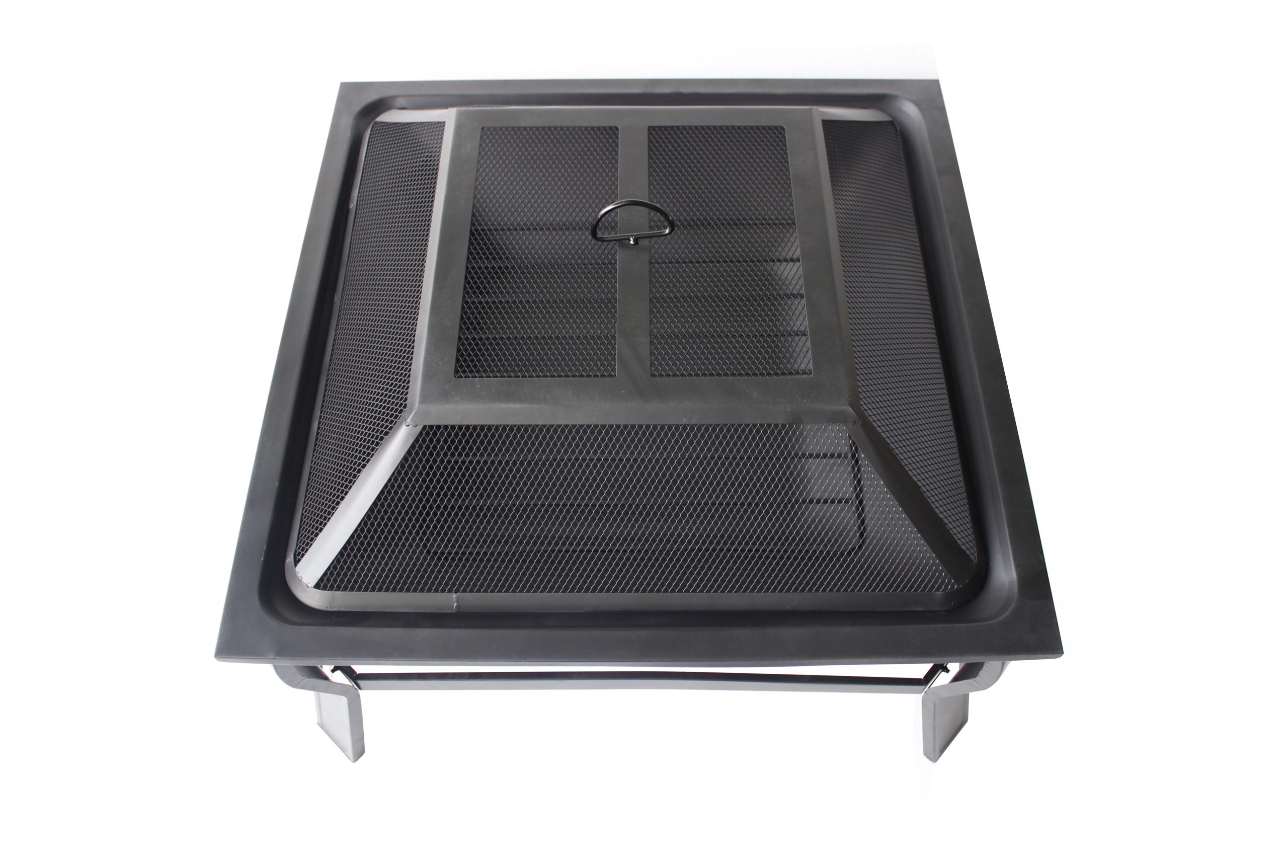 - Square outdoor fire pit set with mesh screen, poker, wood grate, and cover