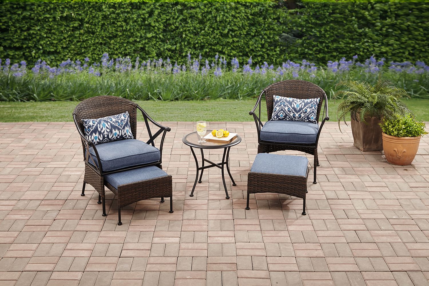 This Skylar Glen 5 Piece Leisure Set can create a wonderful place for comfort and entertaining. The set features 2 woven chairs, 2 coordinating ottomans and a glass-topped side table. The ottomans do double duty as extra seating and slide under the chair when not in use for maximum space saving. The chairs and ottomans have blue cushions and the chairs include a coordinating lumbar pillow for added comfort. Cushions and pillows are UV-treated cushions and are water, mildew and stain resistant.